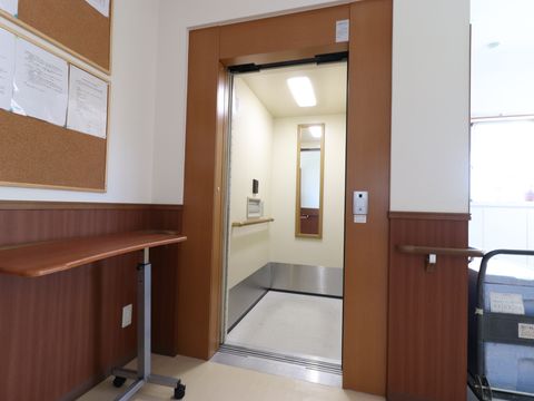 エレベーター内には安全に使用できるよう手すりが設置されています。一人でも車いすで使用できるように、エレベーター内には鏡を設置してあります。