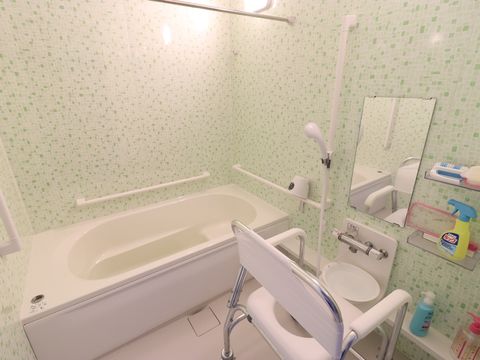 黄緑色の壁が特徴のお風呂場です。至る所に手すりが設置されているので、湯船の出入りが安心して出来ます。